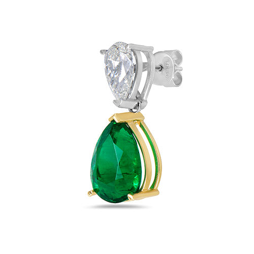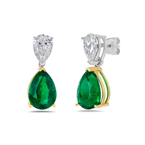 These statement 12.13 ctw  Emerald pear shaped emerald earrings are accented with 4.02 ctw pear shaped white diamond set in 18K white gold