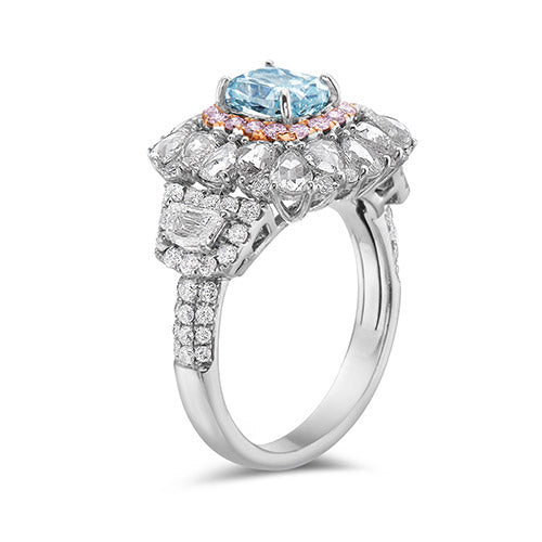 This dazzling 1.20 ctw cushion cut slightly inclined blue diamond ring is accented with 0.23 ctw round pink diamond and 2.70 ctw white diamonds set in 18K two tone gold
