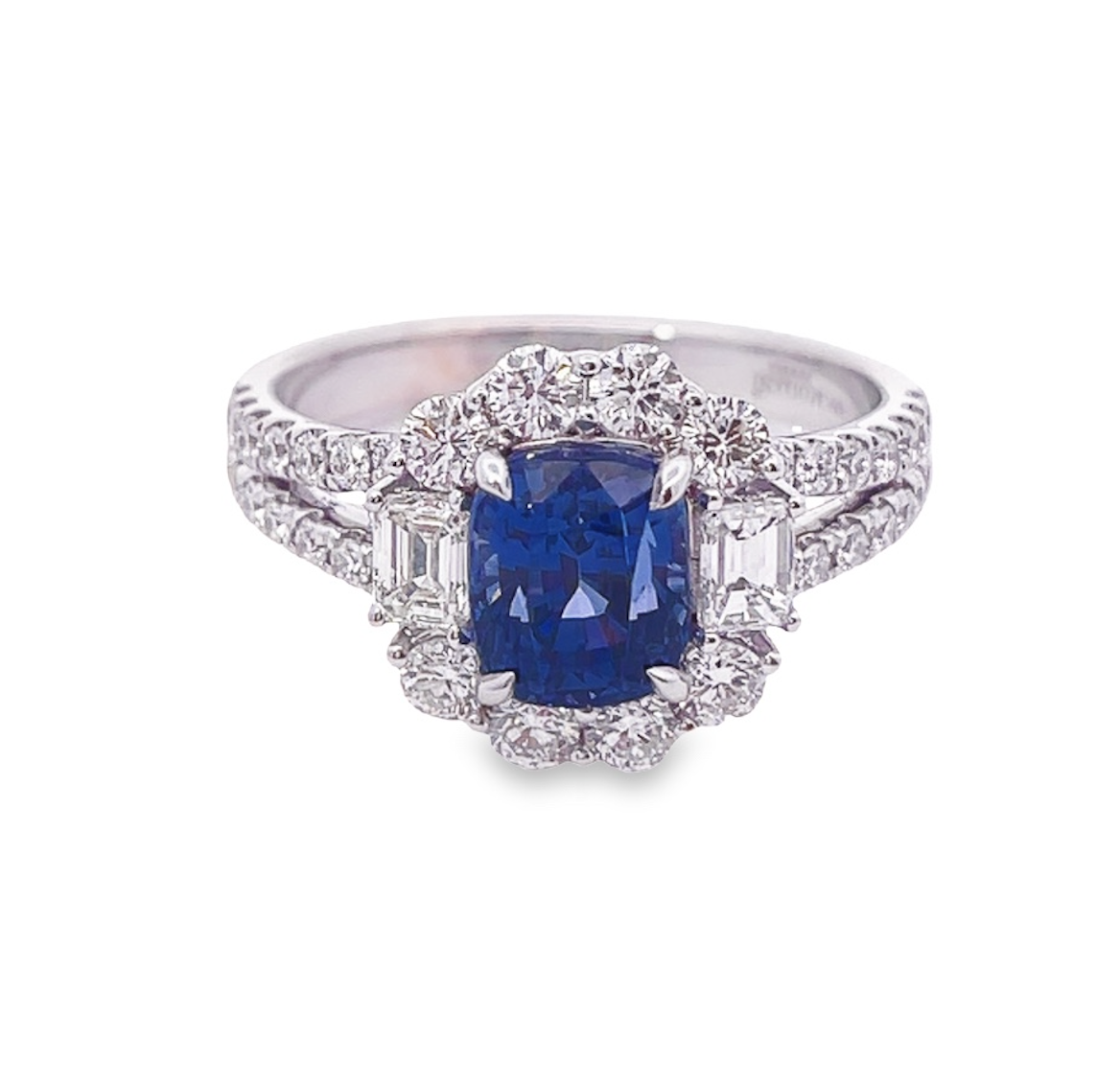 The centerpiece of this ring is the Cobalt Blue Spinel Cushion, weighing 2.08carats. The spinel is a precious gemstone known for its intense blue color, resembling the captivating hue of cobalt. The cushion cut of the spinel gives it a classic and elegant shape, with rounded corners and a brilliant faceted surface that enhances its sparkle and brilliance.