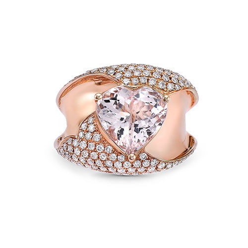 This pretty 3.61 ctw heart shaped morganite ring is accented with 0.89 ctw round pink diamond set in 14K rose gold