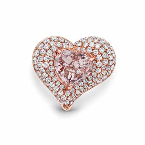 This dazzling 5.13 ctw heart shaped morganite ring is accented with 2.77 ctw round white diamonds set in 14K rose gold