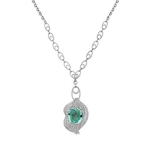 Copper Bearing Tourmaline Oval Shape and Round and Rose Cut White Diamond, 18K White Gold Necklace