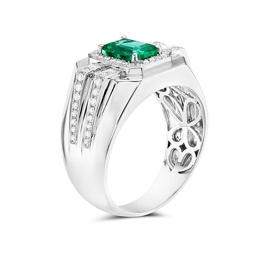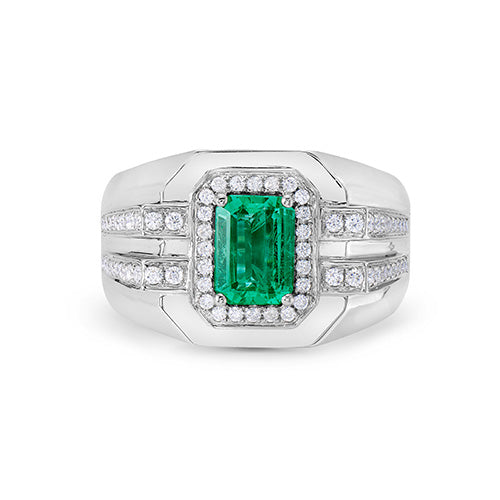 This gorgeous 1.63 ctw octagon-shaped emerald ring is accented with 0.46 ctw round white diamonds set in 14K white gold