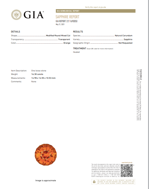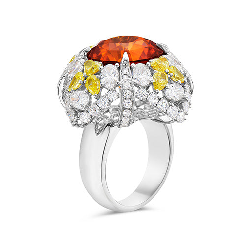 This marvellous 16.30 ctw round orange sapphire ring assents with 4.83 ctw white diamonds and 2.18 ctw yellow diamonds set in 18K two-tone gold