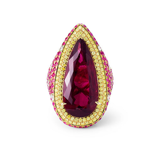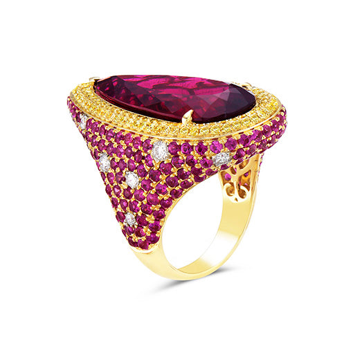This dazzling 14.29 ctw pear shaped rubellite tourmaline ring is accented with 5.65 ctw round sapphire and diamonds set in 18K yellow gold