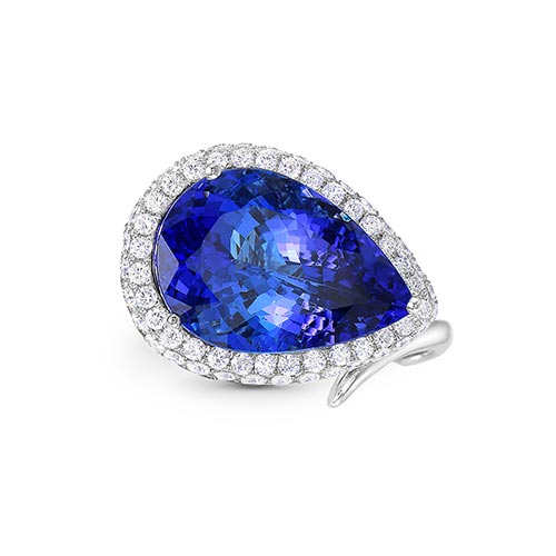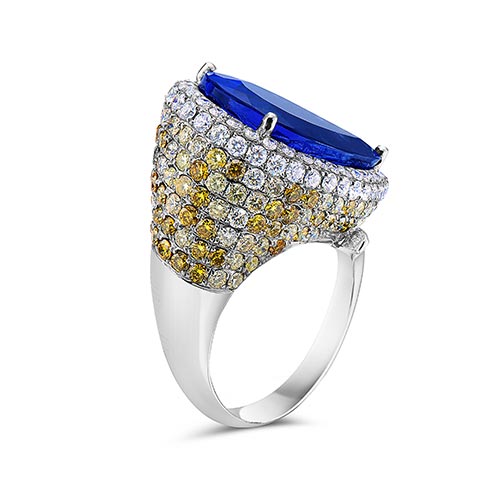 This statement 17.64 ctw pear shaped tanzanite ring is accented with 4.26 ctw round multi-color and white diamonds set in 18k white gold