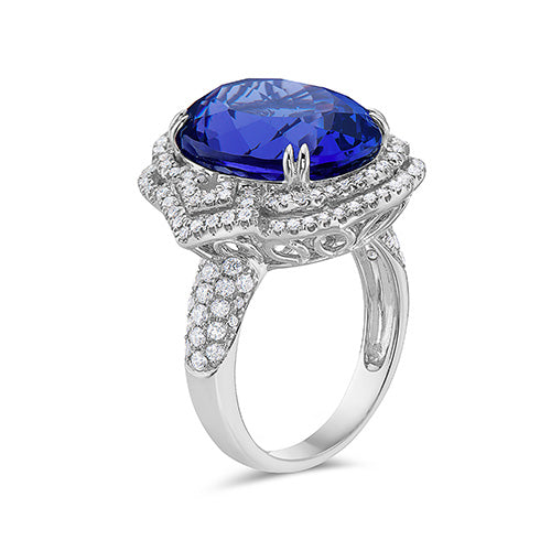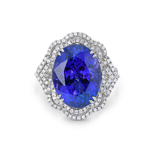 This gorgeous 14.00 ctw oval shaped tanzanite ring is accented with 0.90 ctw white diamonds set in 950 platinum