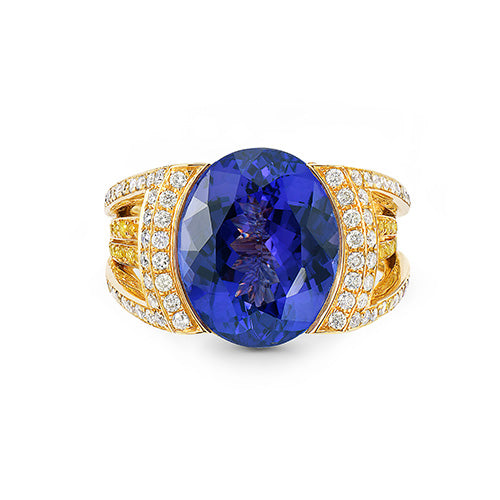 This signature 9.93 ctw tanzanite ring is accented in 1.16 ctw round yellow and white diamonds set in 18K yellow gold