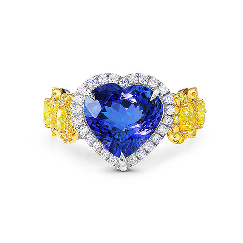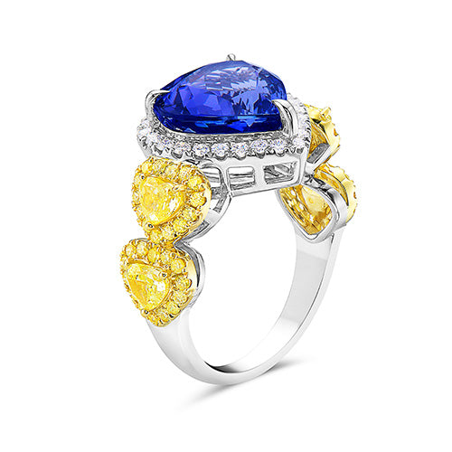 This beautiful 5.49 ctw Tanzanite Heart shaped ring is accented with multi-shape and round 1.92 ctw yellow and white diamonds set in 18K two-tone gold