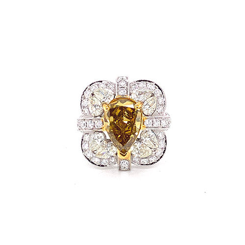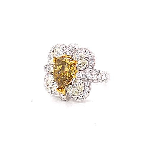 Brownish Yellow Diamond and Pear Shape White Diamond, 18K White Gold Ring