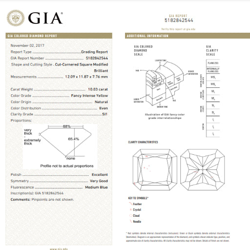 The centerpiece of the ring is the 10.03-carat fancy intense yellow diamond. Fancy intense yellow diamonds are highly prized for their rich and vibrant yellow color. The cushion cut adds a touch of elegance and sophistication to the diamond.