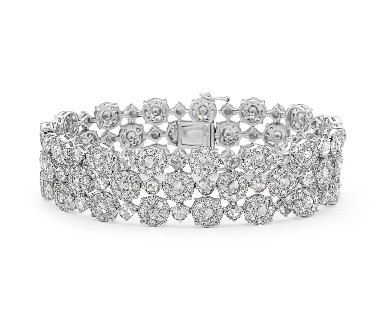 The bracelet features a total diamond weight of 19.52 carats. The diamonds are round-cut, which is a popular and classic shape known for its brilliant sparkle. The color grade of the diamonds is not specified, but they are described as white diamonds, indicating that they likely fall within the near-colorless to colorless range.