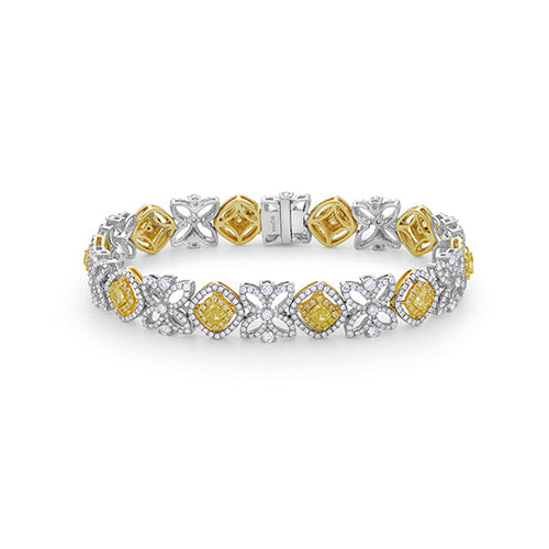 This bracelet showcases a vibrant yellow diamond and sparkling white diamonds set in 18-karat two-tone gold.