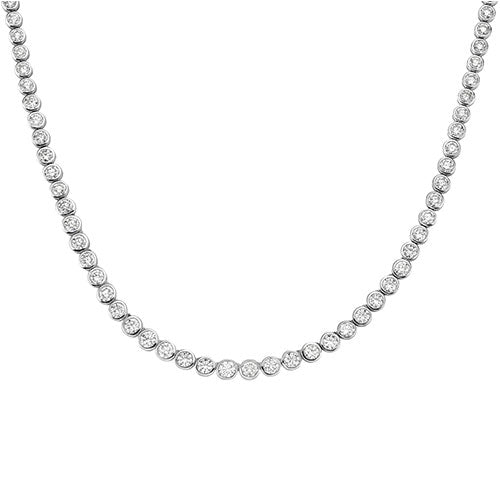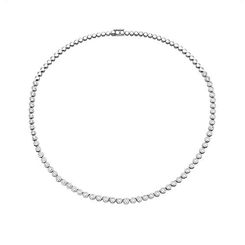 This mesmerizing 12.53 ctw round diamond necklace is set in 14K white gold