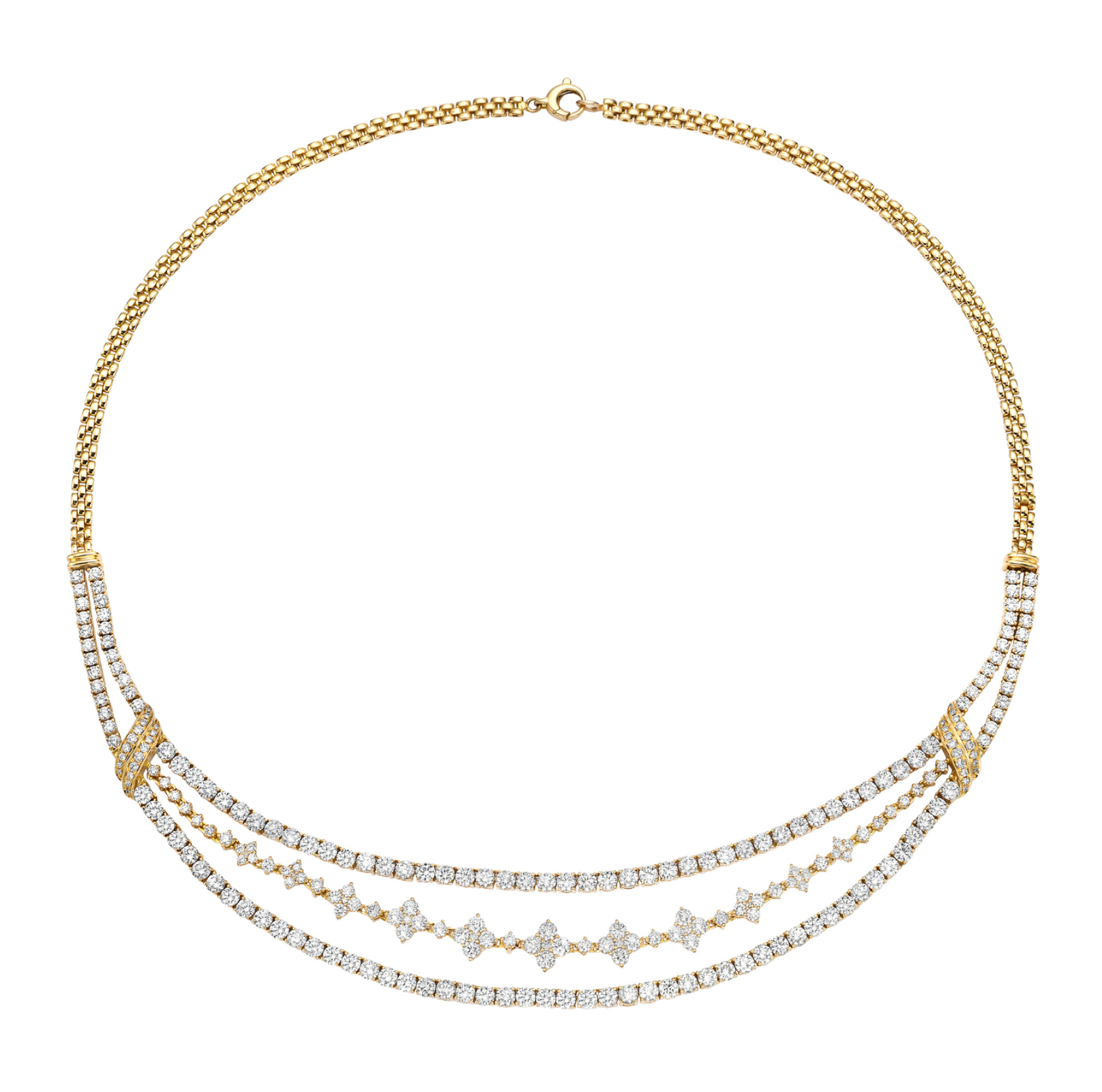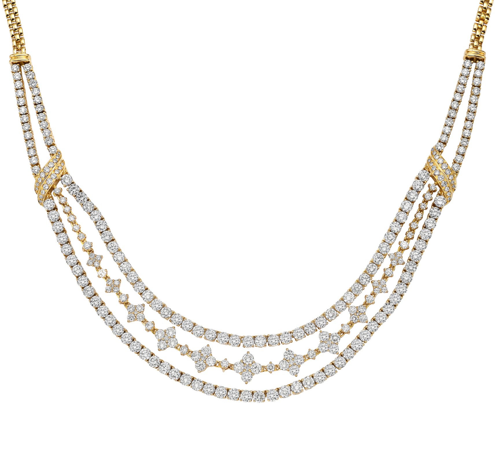 This intricate 15.85 ctw multi-shape diamond necklace is set in 18K yellow gold