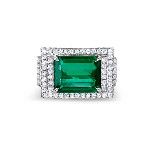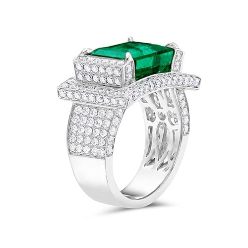 This bold 7.30 ctw emerald cut emerald ring is accented with 2.01 ctw round white diamonds set in 18K white gold