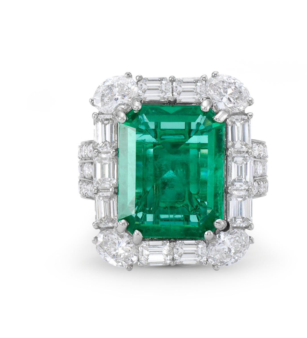 Modani Jewels Emerald Octagon & White Diamond Round, 18K White Gold Ring