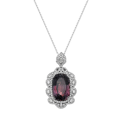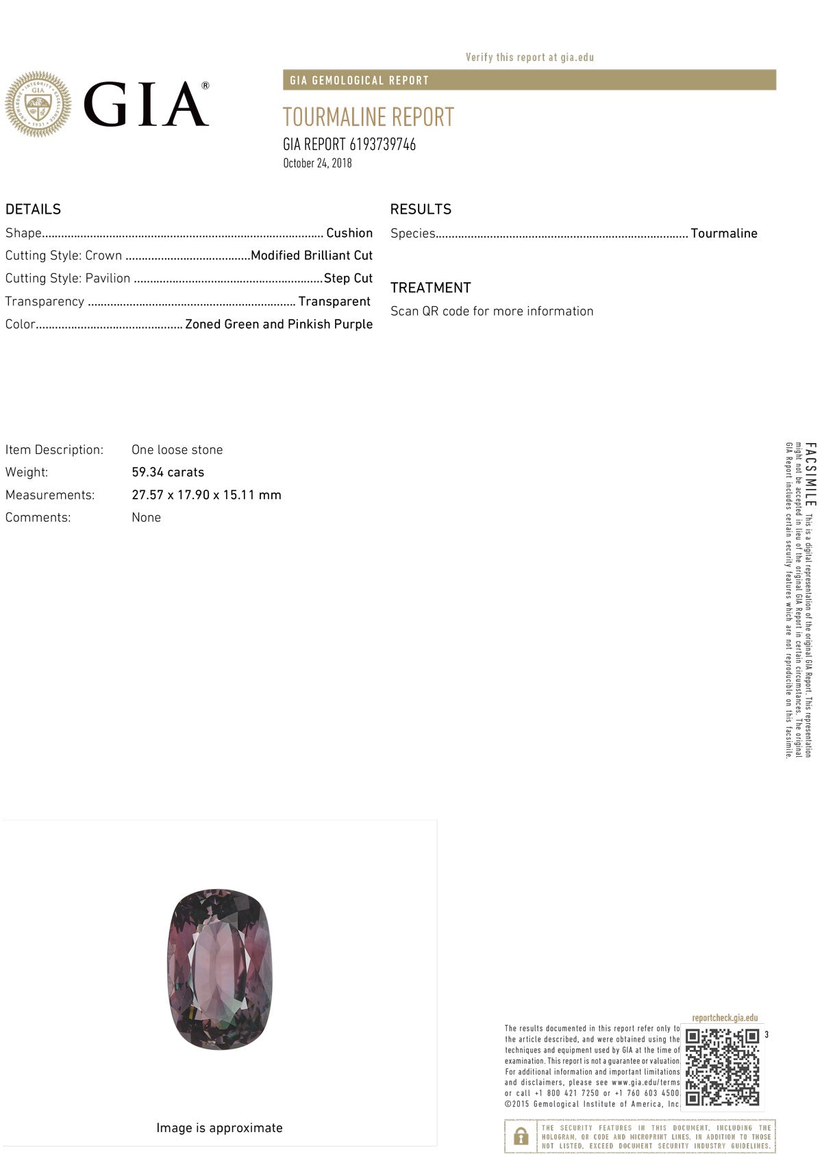 The focal point of the necklace is a mesmerizing 59.30-carat cushion-cut multi tourmaline. The multi tourmaline features a captivating blend of vibrant colors, including shades of green, pink, and yellow. Each stone exhibits its unique beauty, creating a harmonious symphony of hues. The multi-colored tourmalines are meticulously selected for their exceptional quality and stunning color saturation