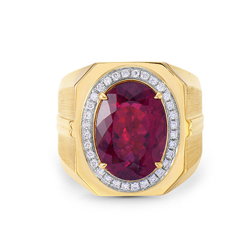 This royal 9.26 ctw oval-shaped rubellite tourmaline is accented by 0.31 ctw round white diamonds set in 18K yellow gold