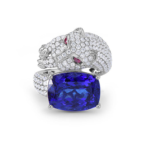 This magnificent 18.81 ctw cushion cut tanzanite ring is accented with 4.16 ctw round ruby and white diamonds set in 18K white gold