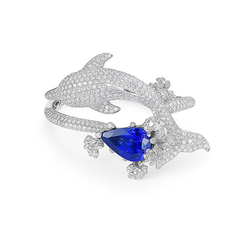 This ensemble 21.67 ctw pear shaped tanzanite and 22.23 ctw sapphire bracelet is accented with round white diamonds set in 18K white gold