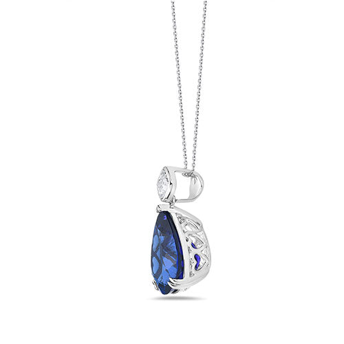 This eternal 18.09 ctw pear shaped tanzanite necklace is accented with 1.01 ctw cushion cut white diamond set in 18K white gold