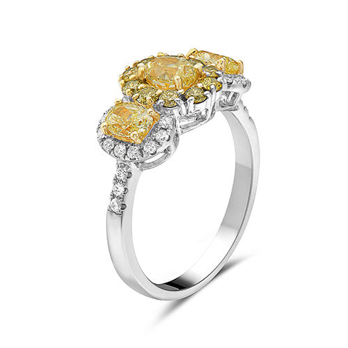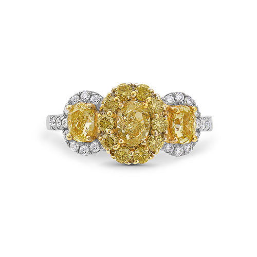 This dazzling 1.80 ctw yellow diamond ring is accented with 0.13 ctw white diamonds set in 14K two-tone gold