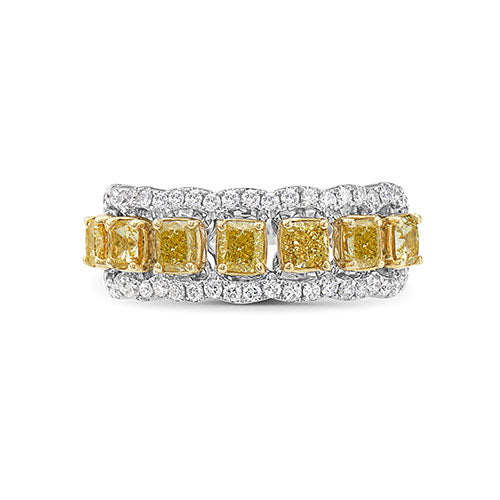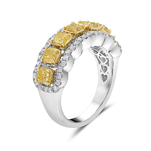 This beautiful 2.21 ctw multi-shaped yellow diamond ring is accented with 0.5 ctw round white diamonds set in 18K two-tone gold