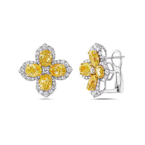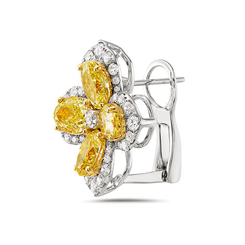 These dazzling 5.93 ctw multi shape yellow diamonds earrings are accented with 1.19 ctw round white diamond set in 18K two tone gold
