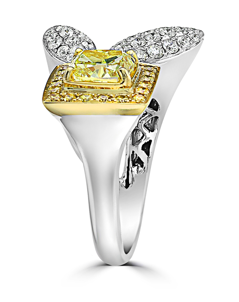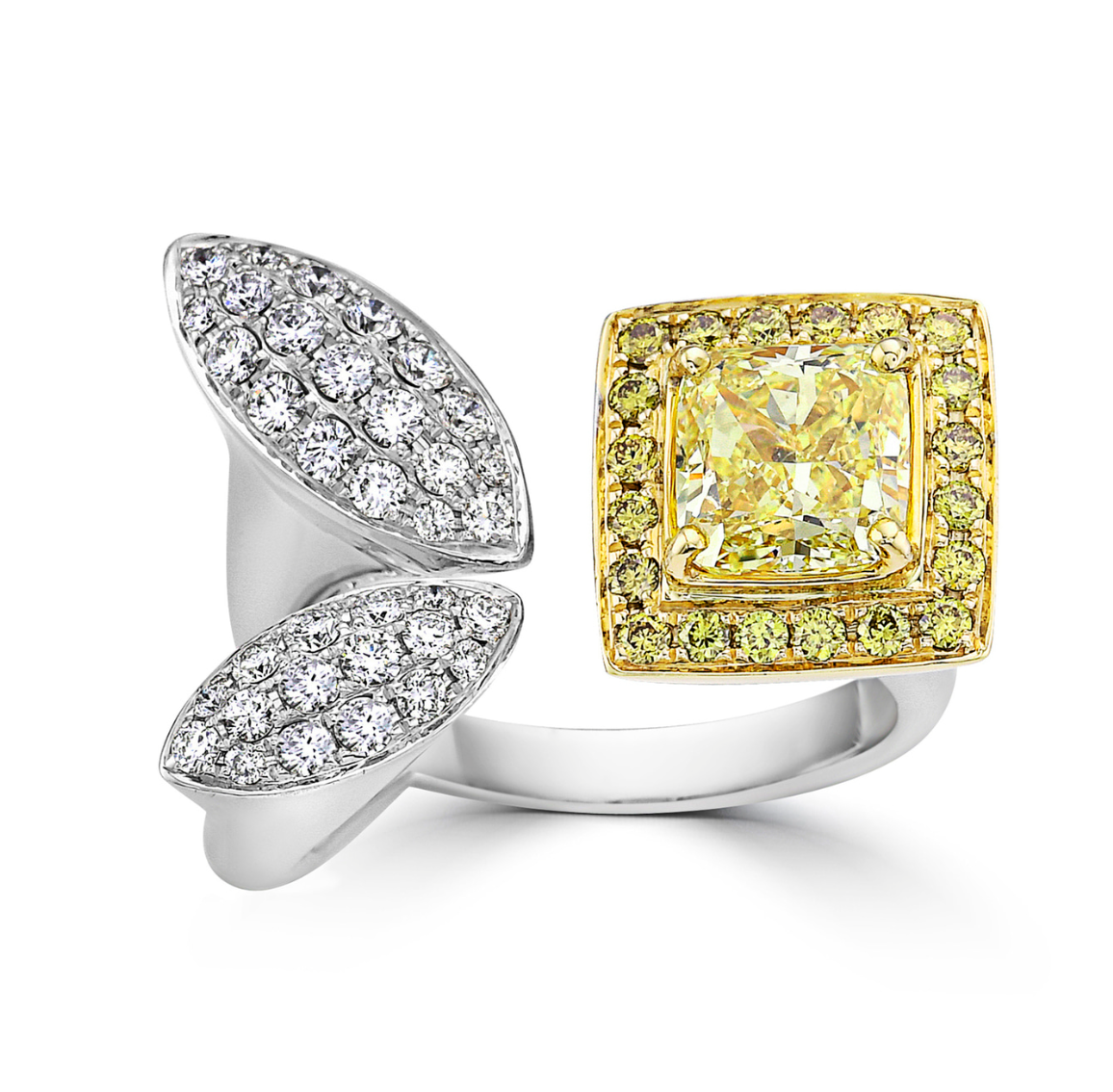 This ring is truly one of a kind. It features a beautiful 2.01ct yellow diamond cushion cut, with 0.29ct orange diamond accents. The white diamonds are a stunning 0.56ct, and the ring is set in 18K yellow and white gold. This ring is perfect for someone who loves unique, one of a kind jewelry. Not only is it eye-catching, but its symbolism and meaning are exceptional. This ring symbolizes love, connection, friendship, and a commitment to happiness. It’s the perfect gift for someone who wants to show their special someone just how much they mean to them. Whether it's an anniversary, birthday, Valentine's Day, or just a beautiful reminder of your love, this ring is sure to be cherished for years to come.