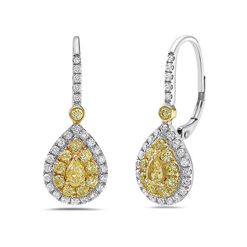 These stylish 0.42 ctw pear shaped yellow diamond earrings are accented with 0.66 ctw yellow diamonds and 0.58 ctw white diamonds set in 14K two tone gold